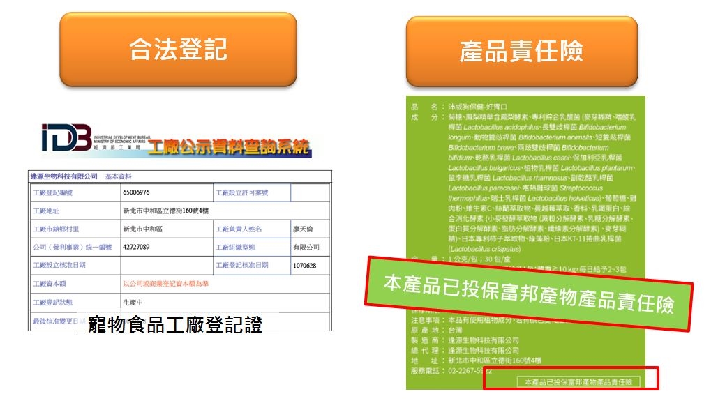 於是我們用人類保健食品規範等級,去要求寵物保健食品工廠,第一時間就要取得寵物食品工廠登記證!並且為產品投保產品責任險