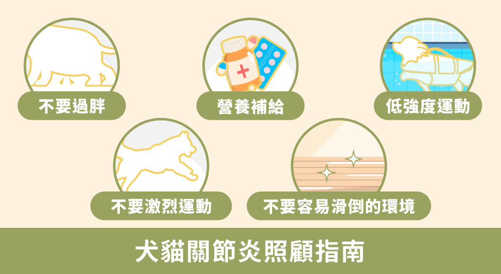 面對狗狗貓咪的關節炎問題時,第一時間請諮詢您的獸醫師,討論是否需要採取內科或是外科的治療方式;除此之外,平時照護需要著重於舒緩關節疼痛不適。