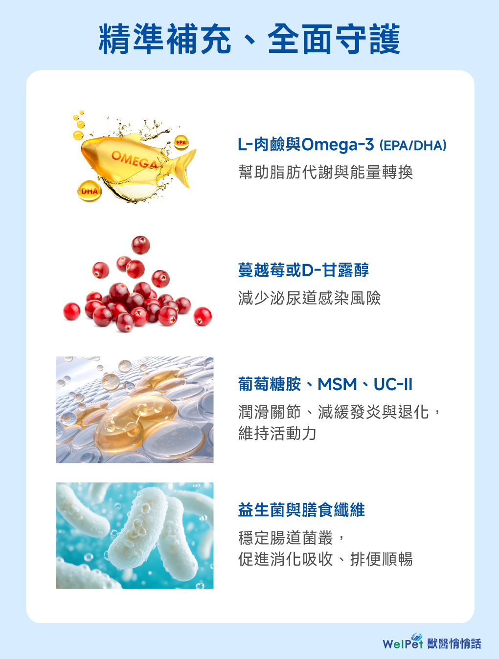 結紮後的貓狗,需要更有策略的營養補充。透過日常飲食或保健品加入以下成分,有助於維持理想體態與健康系統運作,是術後保養不可或缺的一環: