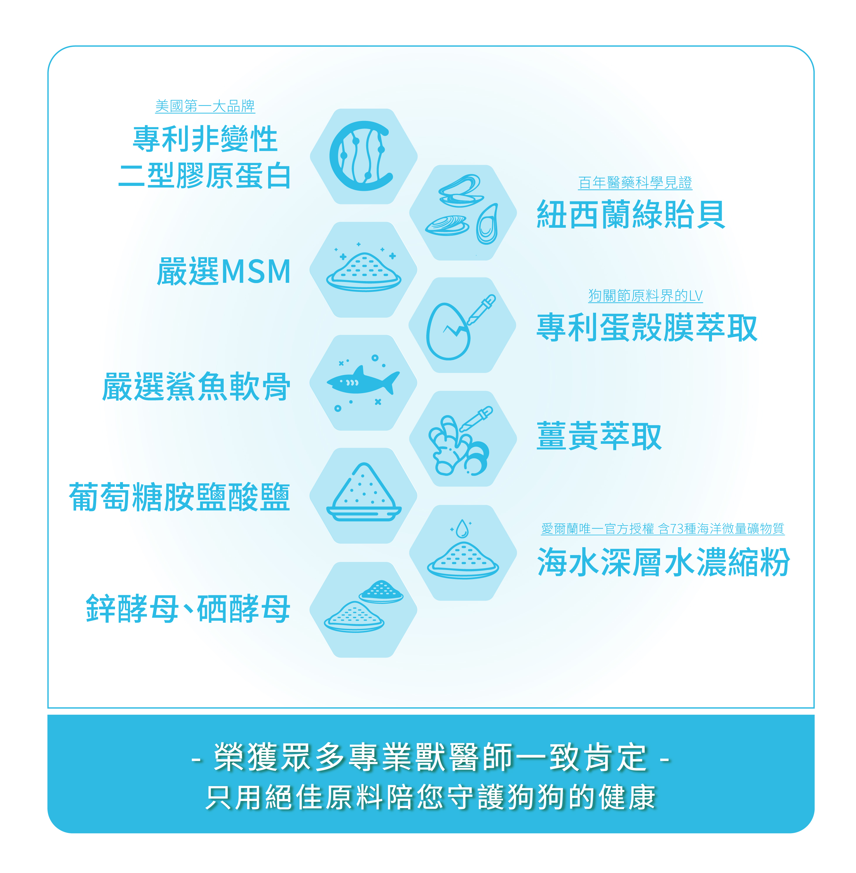 MSM存在於動物關節、肌肉及皮膚中的有機物質。在日常生活中存在於肉類、蔬菜或水果等食材中,幫助強化狗狗韌帶細胞及軟骨組織。建議每日補充,幫助狗狗骨骼正常發育。