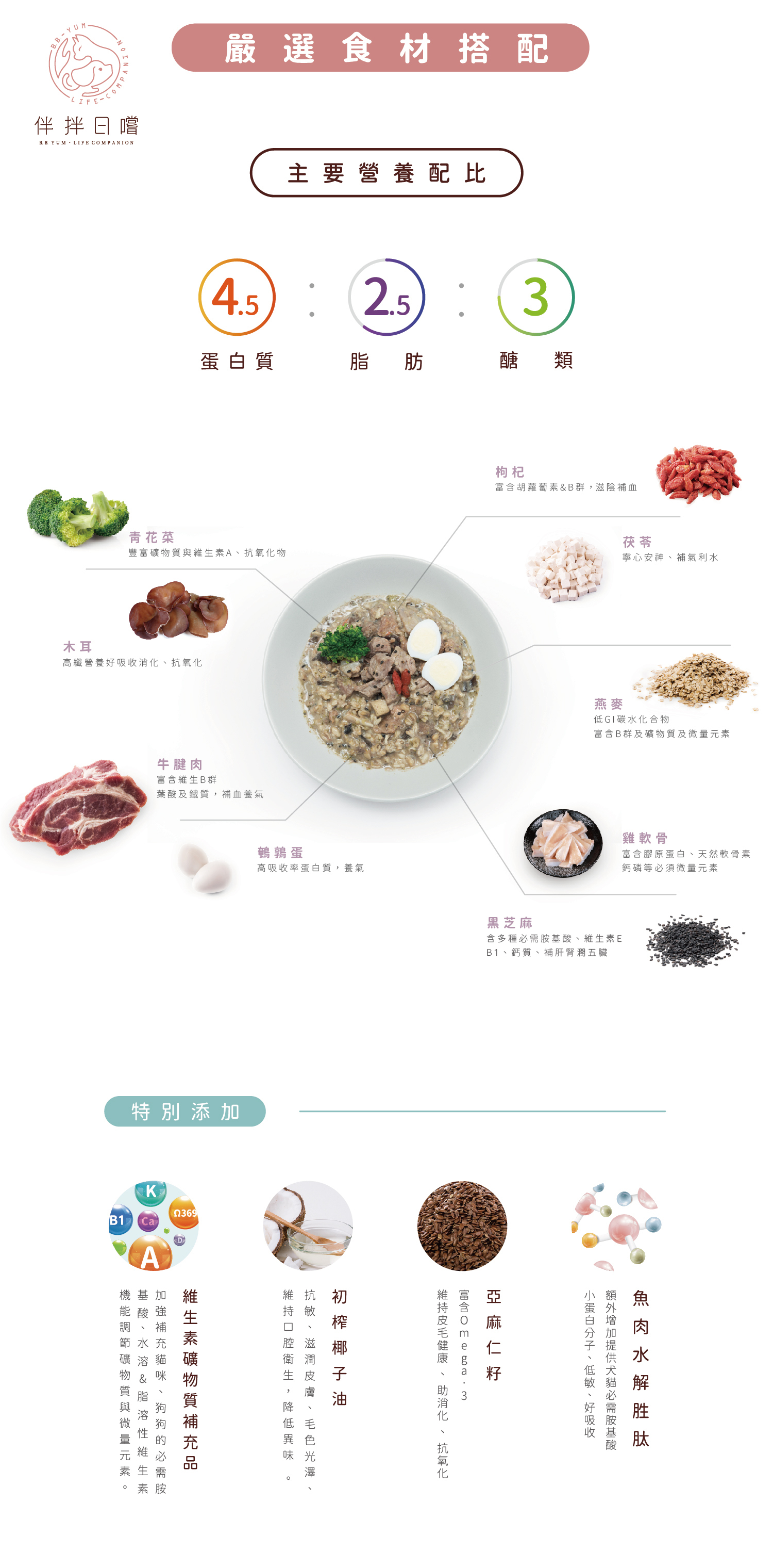 牛腱肉、鵪鶉蛋、雞軟骨、燕麥、青花菜、黑木耳、黑芝麻、茯苓、枸杞、秘製柴魚雞湯、初榨椰子油、亞麻仁籽粉、碳酸鈣、魚肉水解胜肽、綜合維生素礦物質