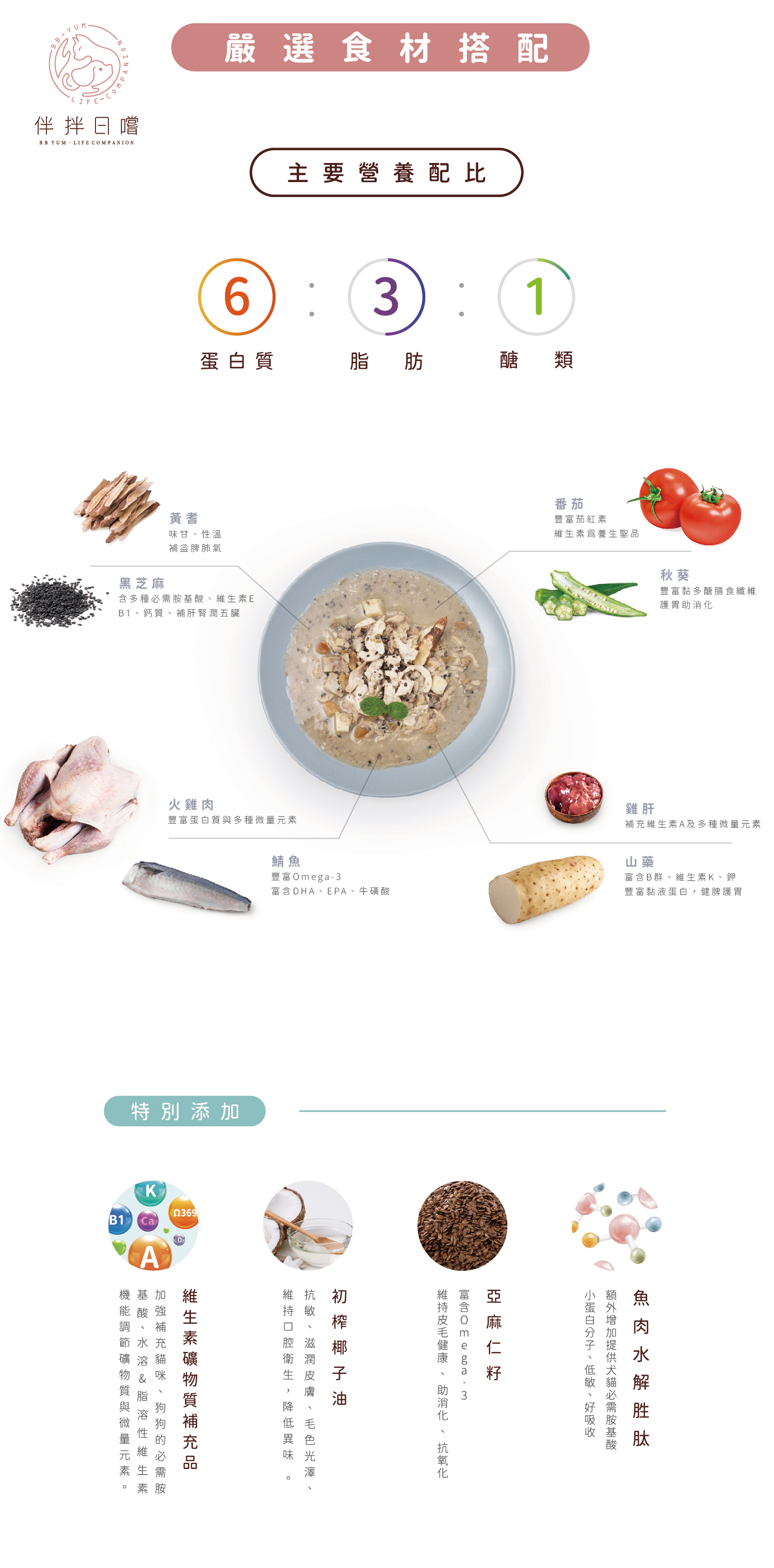 火雞肉、鯖魚、雞肝、番茄、山藥、秋葵、黑芝麻、黃耆、秘製柴魚雞湯、初榨椰子油、亞麻仁籽粉、碳酸鈣、魚肉水解胜肽、綜合維生素礦物質