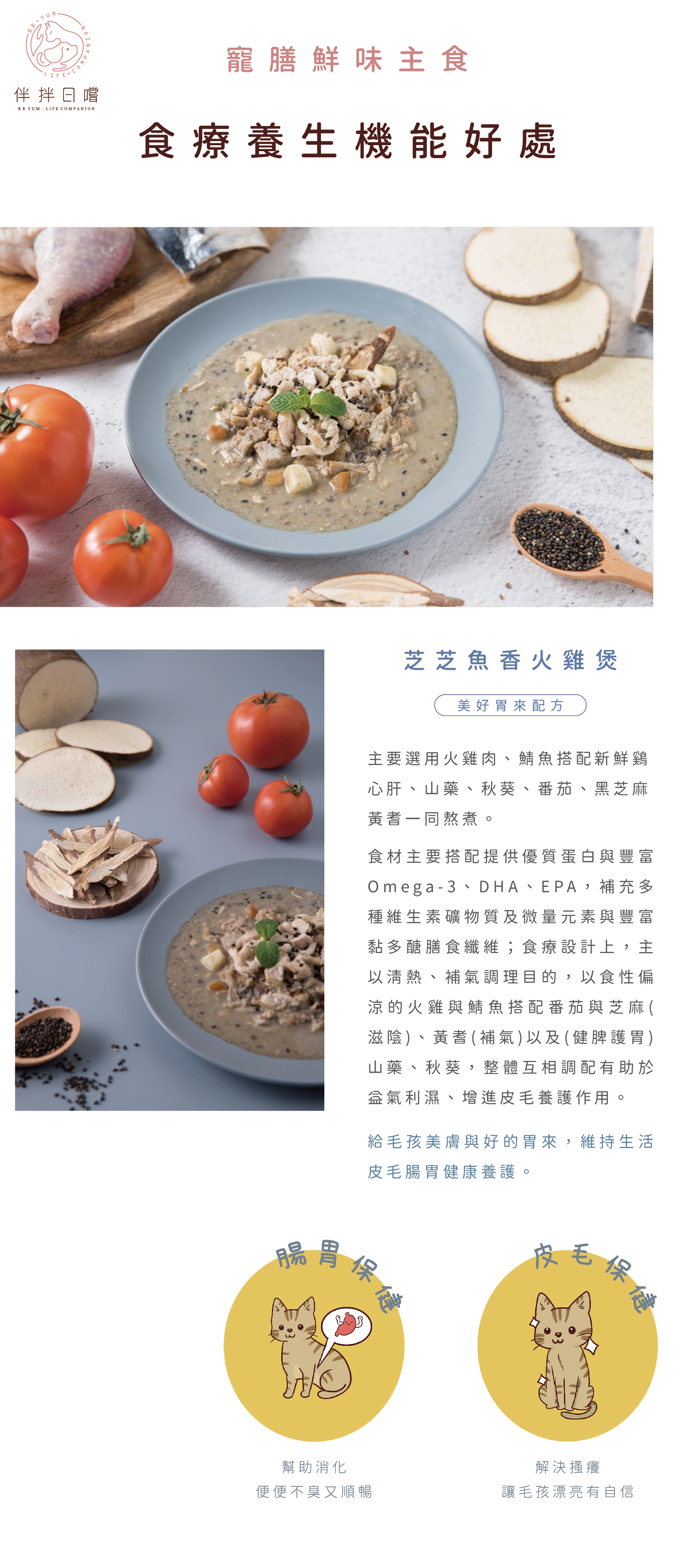 3.寵膳鮮味主食概念為【食療養生】,目的是藉由配方鮮食作為日常調理與保健,而並非"治療"功效,如家中毛孩有任何特殊狀況應先協尋專業獸醫。