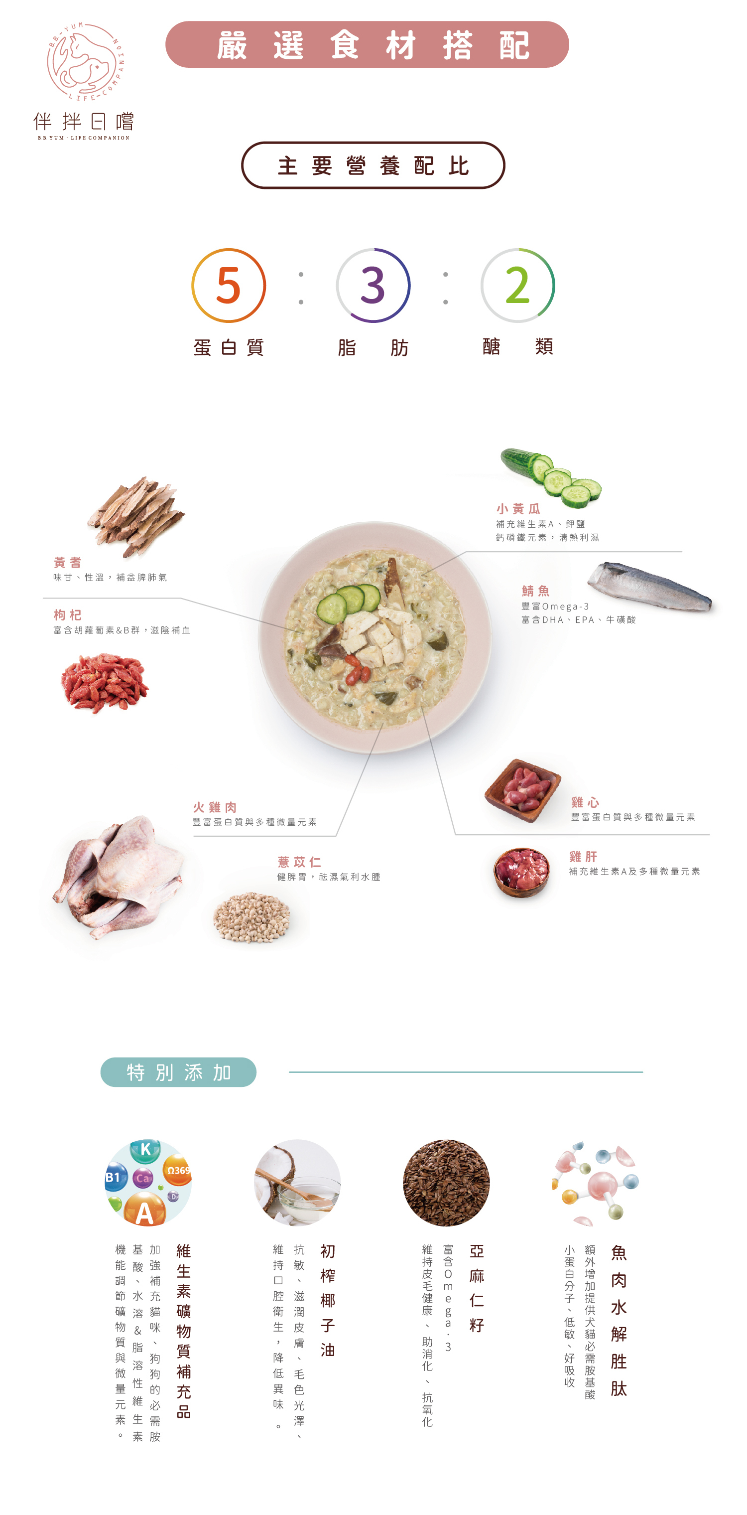 3.寵膳鮮味主食概念為【食療養生】,目的是藉由配方鮮食作為日常調理與保健,而並非"治療"功效,如家中毛孩有任何特殊狀況應先協尋專業獸醫。