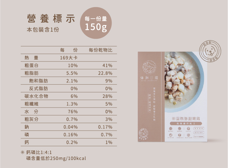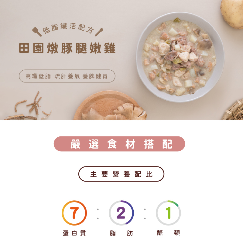 豬腿肉、雞胸肉、馬鈴薯、西芹菜、袖珍菇、柴胡、秘製柴魚雞湯、初榨椰子油、亞麻仁籽粉、碳酸鈣、魚肉水解胜肽、綜合維生素礦物質