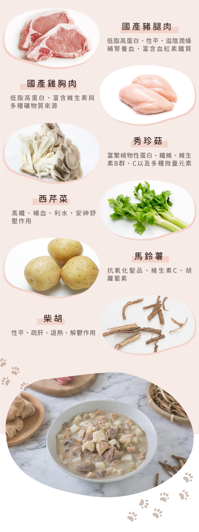 豬腿肉、雞胸肉、秀珍菇、芹菜、馬鈴薯、柴胡、營養雞湯、碳酸鈣、魚肉水解胜肽、綜合維生素礦物質